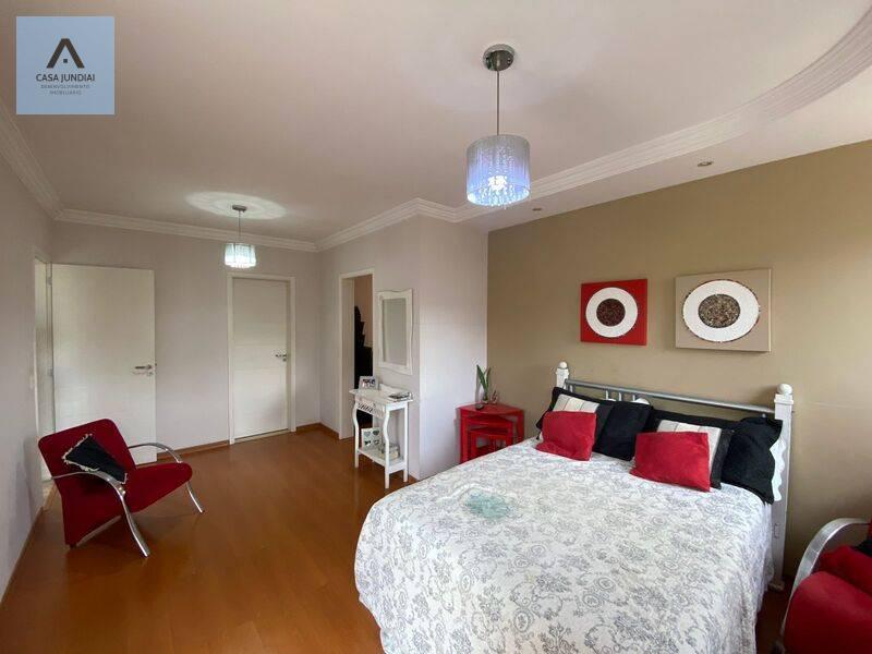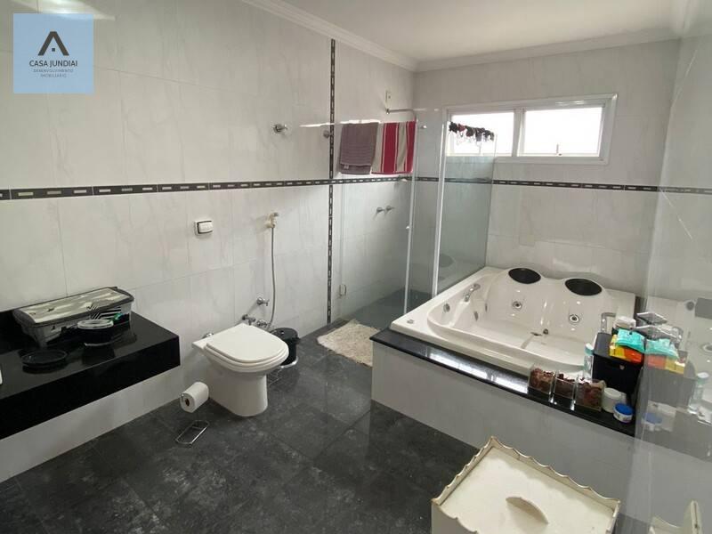 Suíte máster com closet e banheiro amplo com banheira.